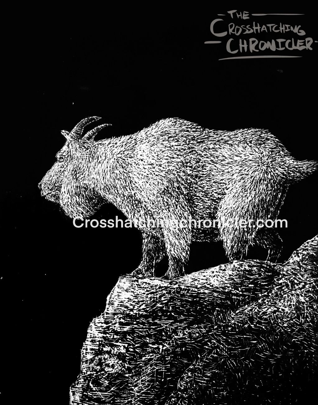 Scratchboard. A mountain goat pondering; gazing at the stars.